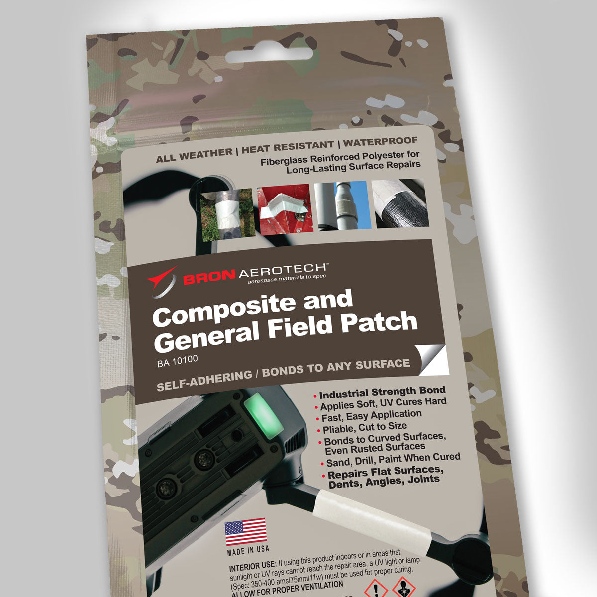 BA 10100 Composite & General Field Patch is a unique in-field composite and general adhesive patch material designed to reduce downtime for aircraft, weapons, marine and other vehicles and applications. BA 10100 is great for drone (AUS, UGV, UUV, etc.) onsite repairs. It quickly cures and hardens in direct UV light or the sun’s natural UV rays. BA 10100 is ideal for general maintenance applications and bonds well to fiberglass, plastic, metal, rubber, pipes and hoses.